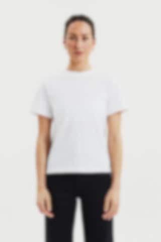 A modern classic with a high neck and boxy design. Made of dense, soft organic cotton which isn't see-through and is perfect for all occasions, whether you want to be sporty, casual or dressed up. Wear it tucked in or out. Concealed seam in the neckline and normal length sleeves.