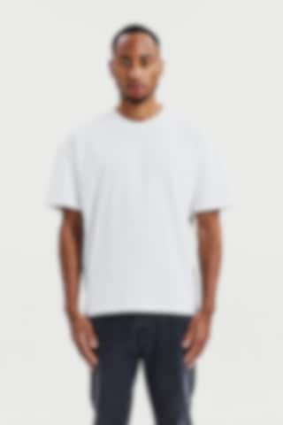Crafted from sturdy 300 gsm organic cotton fabric, this T-shirt offers a substantial feel and exceptional comfort. It features a robust neckline with top stitch detailing and stylish side slits. With slightly extended sleeves and broader shoulders, it gives a subtle oversized look. This piece truly shines when worn solo, delivering an effortlessly cool aesthetic.