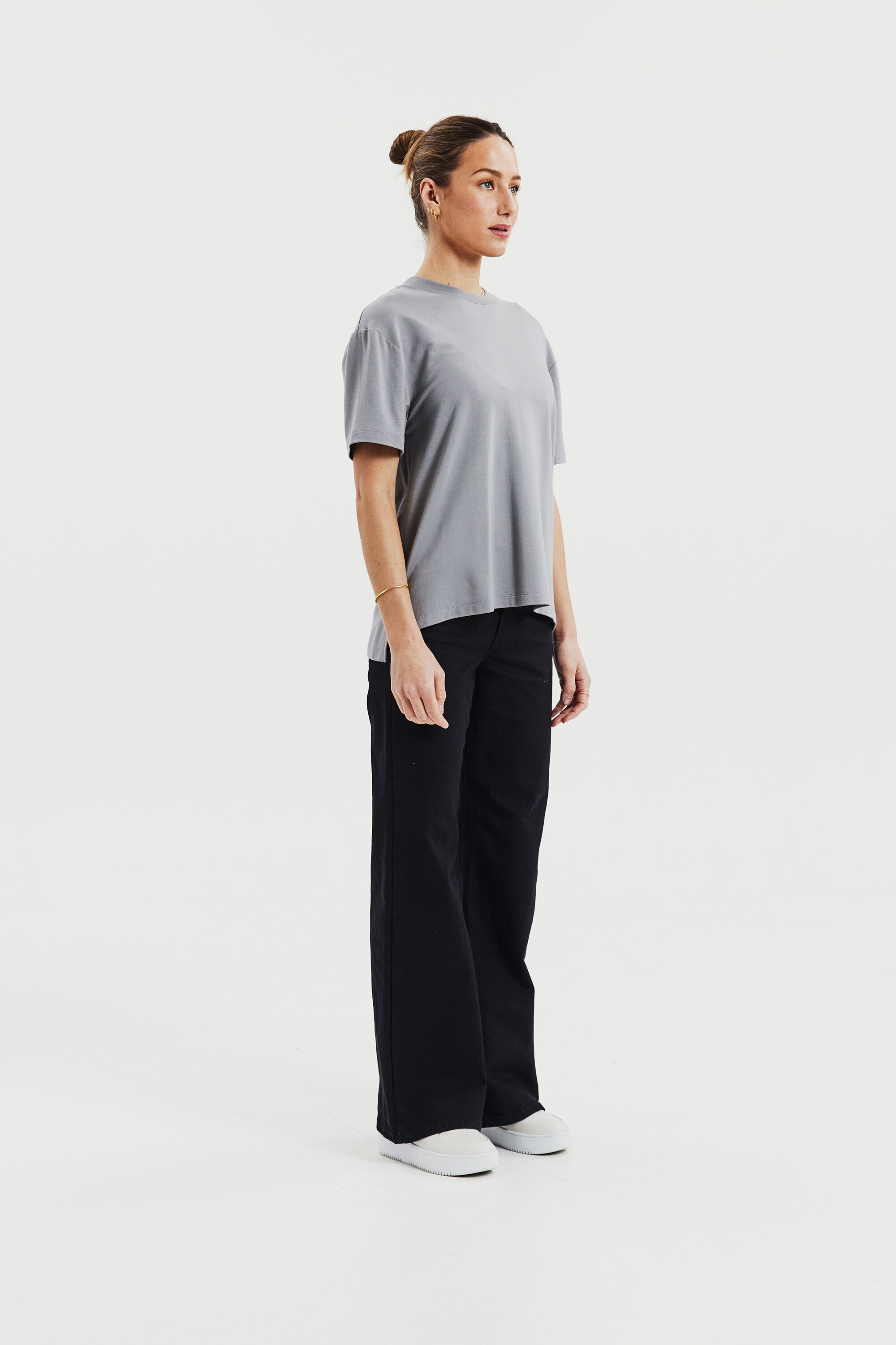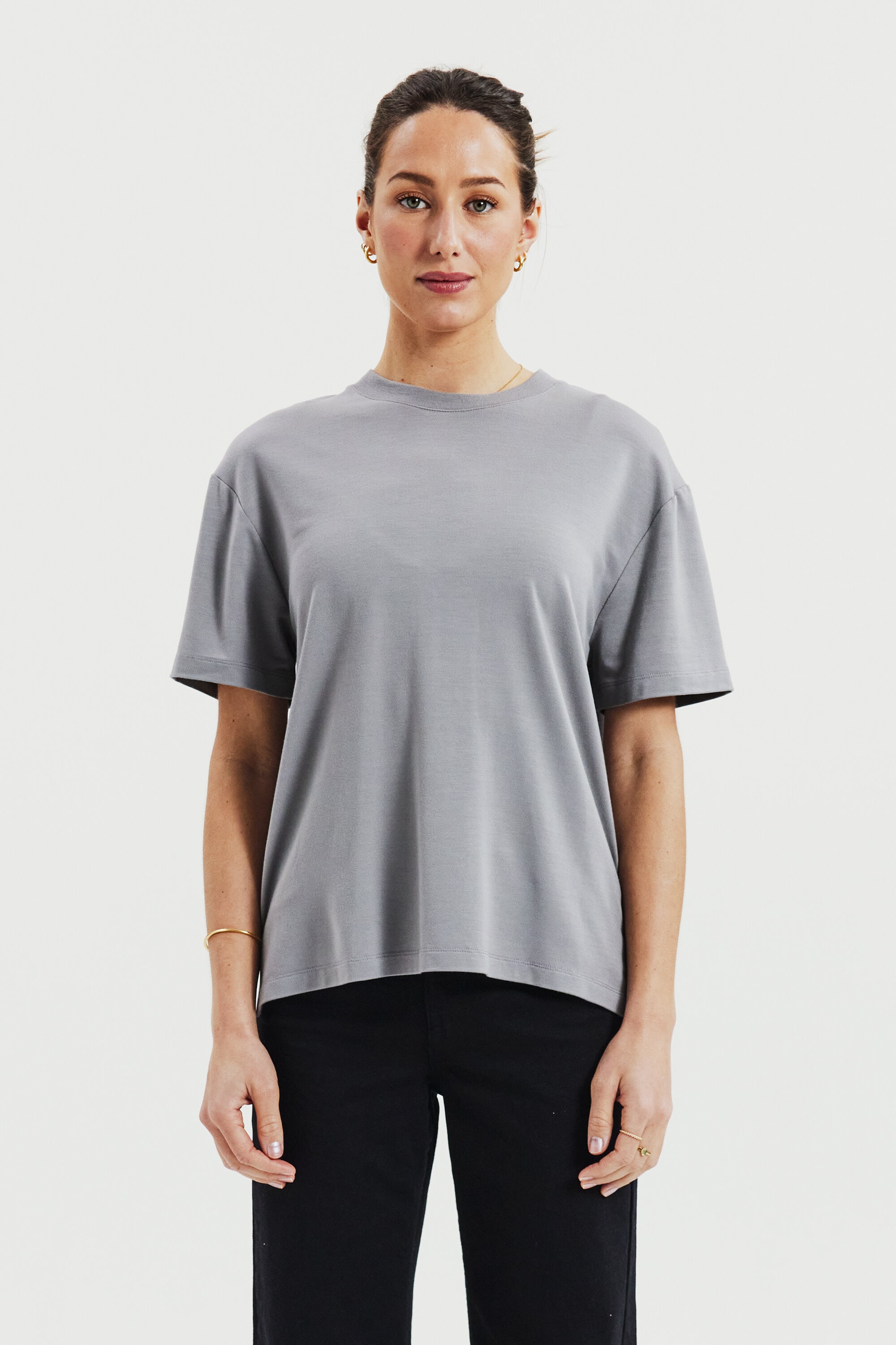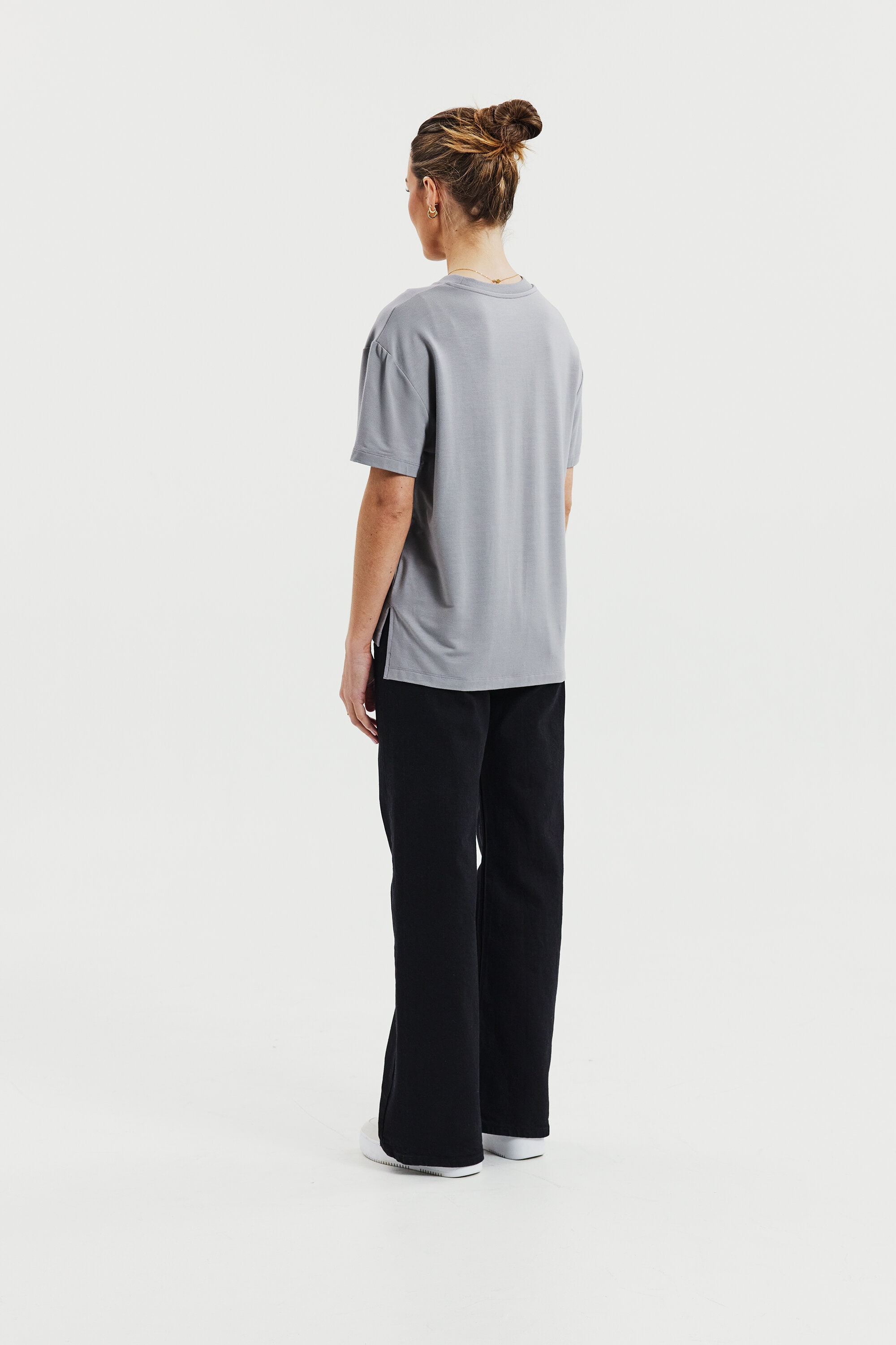 Experience the luxurious feel of our heavy viscose jersey fabric with its exquisite drape. The boxy fit and side slits provide exceptional comfort. The combination of this premium fabric and contemporary cut gives our T-shirt an updated and elegant look that is truly remarkable.